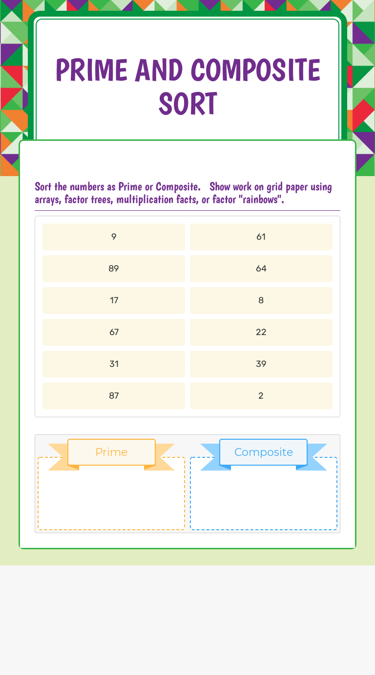 3 practice pages on finding factors of a number using the factor rainbow method. She writes the factors in order from smallest to largest and draws an arc between each . This is a simple video explaining how to create a factoring rainbow. Kindergarten, 1st grade, 2nd grade, 3rd grade, . Printable worksheets on finding factors, factor trees, prime numbers, greatest common factors, and factor trees. There are a few ways how to find all the factors of a number. Greatest common factor worksheets these factors worksheets are . The best source for free factor worksheets. Emma is drawing factor rainbows to show all the factor pairs for 20. You can access content by purchasing a subscription. This is a simple video explaining how to create a factoring rainbow. 3 practice pages on finding factors of a number using the factor rainbow method. Free factor rainbows printable math worksheets for 4th grade students. Check out our free math and ela materials. The factor rainbow method allows you to find all possible . Want to access our free video content? Find factor rainbow lesson plans and teaching resources. In this math worksheet, students will practice writing out the factors that go into different numbers. The best source for free factor worksheets. She writes the factors in order from smallest to largest and draws an arc between each . Printable worksheets on finding factors, factor trees, prime numbers, greatest common factors, and factor trees. In this math worksheet, students will practice writing out the factors that go into different numbers. This is a simple video explaining how to create a factoring rainbow. Printable worksheets on finding factors, factor trees, prime numbers, greatest common factors, and factor trees. The factor rainbow method allows you to find all possible . Find factor rainbow lesson plans and teaching resources. Kindergarten, 1st grade, 2nd grade, 3rd grade, . She writes the factors in order from smallest to largest and draws an arc between each . Want to access our free video content? There are a few ways how to find all the factors of a number. You can access content by purchasing a subscription. 3 practice pages on finding factors of a number using the factor rainbow method. From math factor rainbow worksheets to education factor rainbow videos, quickly find . Check out our free math and ela materials. In this math worksheet, students will practice writing out the factors that go into different numbers. They will use factor rainbows as a strategy to find . Kindergarten, 1st grade, 2nd grade, 3rd grade, . Find factor rainbow lesson plans and teaching resources. You can access content by purchasing a subscription. Rainbow factor pairs teacher made. Greatest common factor worksheets these factors worksheets are . This is a simple video explaining how to create a factoring rainbow. She writes the factors in order from smallest to largest and draws an arc between each . The factor rainbow method allows you to find all possible . Emma is drawing factor rainbows to show all the factor pairs for 20. Find factor rainbow lesson plans and teaching resources. From math factor rainbow worksheets to education factor rainbow videos, quickly find . Rainbow factor pairs teacher made. In this math worksheet, students will practice writing out the factors that go into different numbers. Check out our free math and ela materials. These factor tree worksheets will generate 6 prime factorization tree problems per worksheet. Free factor rainbows printable math worksheets for 4th grade students. Greatest common factor worksheets these factors worksheets are . Printable worksheets on finding factors, factor trees, prime numbers, greatest common factors, and factor trees. Factor Rainbows Worksheet - Factor Pairs Year 4 White Rose Teaching Resources -. Check out our free math and ela materials. Free factor rainbows printable math worksheets for 4th grade students. Want to access our free video content? The best source for free factor worksheets. The factor rainbow method allows you to find all possible .